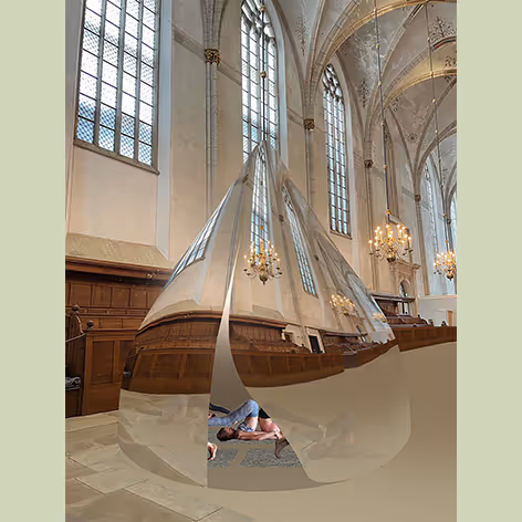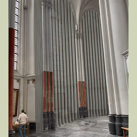 We passen materialen en kleuren toe die zowel qua warmte als akoestiek waarde kunnen toevoegen aan het duurzame concept in hun ‘natuurlijke’ kleuruiting. Basistextielen die van oudsher veel voorkwamen in de kerk: wol (warm en dempend), velour (diep en vallend), linnen (sober en koel). En innovatieve textielen die iets kunnen bijdragen aan de functie en/of sfeer van de kerk: mycelium (zacht en aards), spiegelfolie (spectaculair en isoleren), grafiet textiel (stralingsvrij en anoniem), FeatherSilk (glanzend en bewegend). De nieuwe paramenten spelen met de mogelijkheden die de bestaande architectuur biedt, zonder deze aan te tasten. De verticaliteit van de constructies, gericht op het leggen van een verbinding tussen het aardse, profane en het religieuze, sacrale, blijft in volle glorie aanwezig.